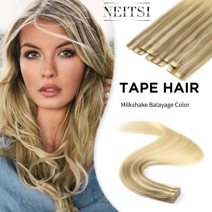 Neitsi Remy Tape In Invisible Human Hair Extensions Double Drawn Adhesive Straight Skin Weft Hair 20" 2.5g/s Balayage Color